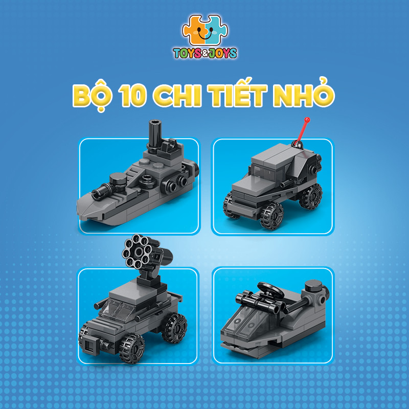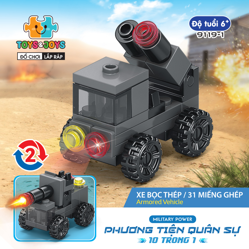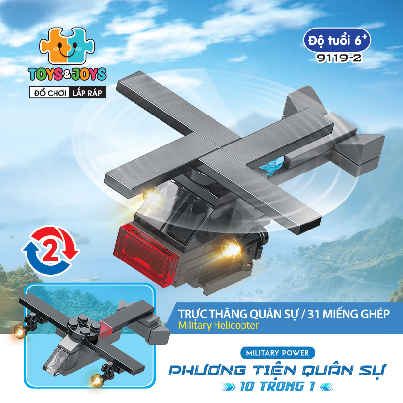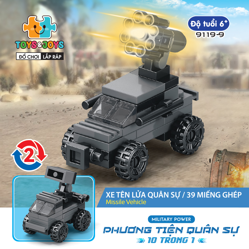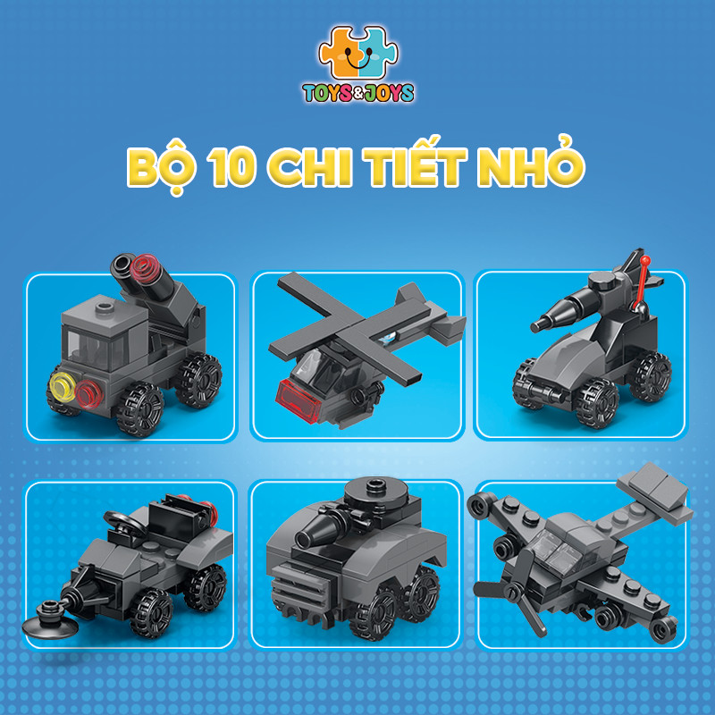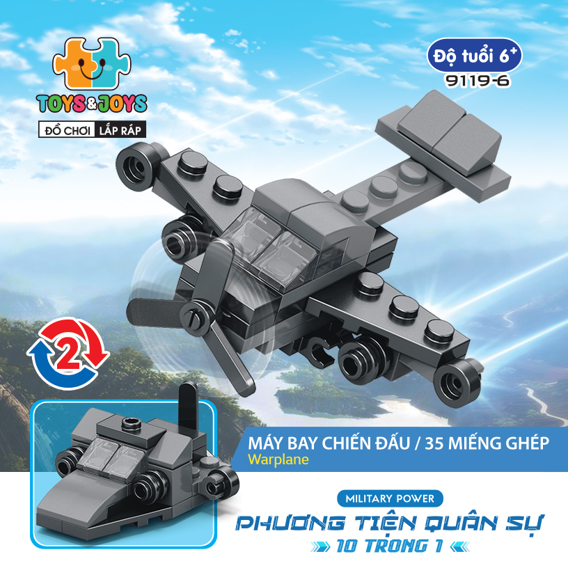 Từ 10 hộp nhỏ, bé có thể tạo nên 1 phương tiện lớn hơn là chiếc máy bay quân sự cực ngầu. Hãy tham gia những trận chiến đầy cam go và hấp dẫn ngay bây giờ cùng set Phương tiện quân sự 10 trong 1 nhé