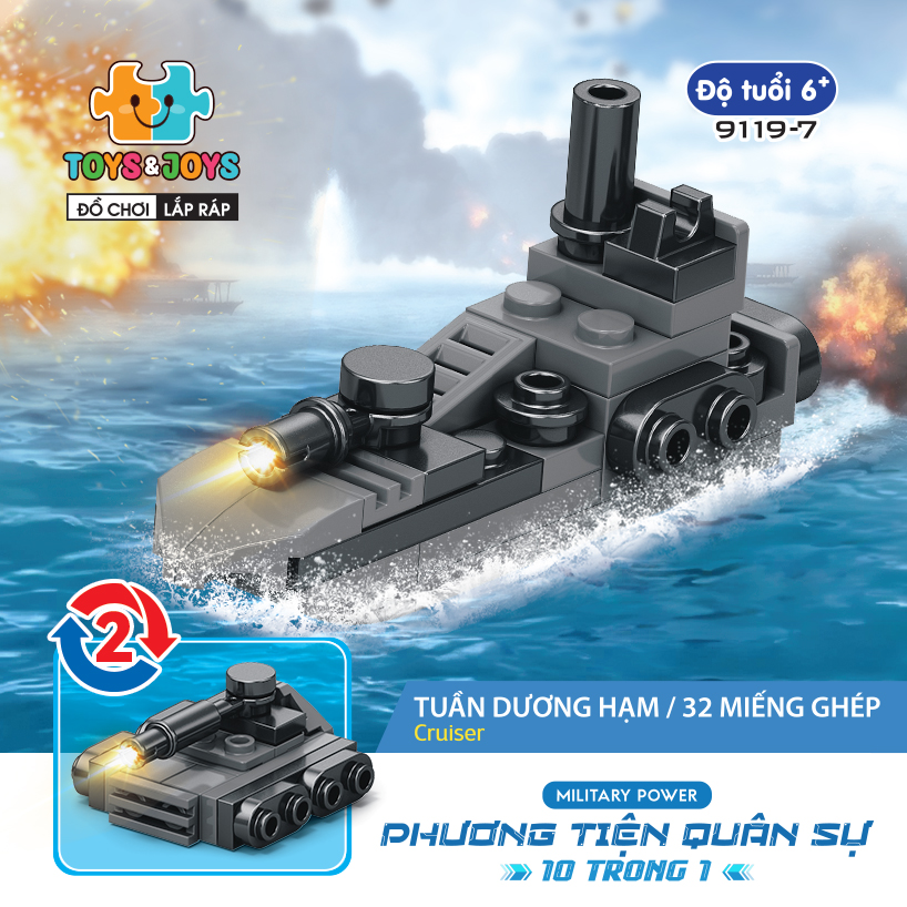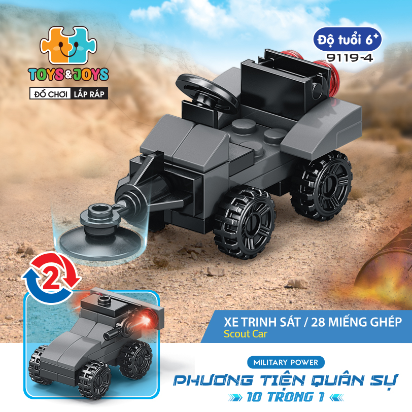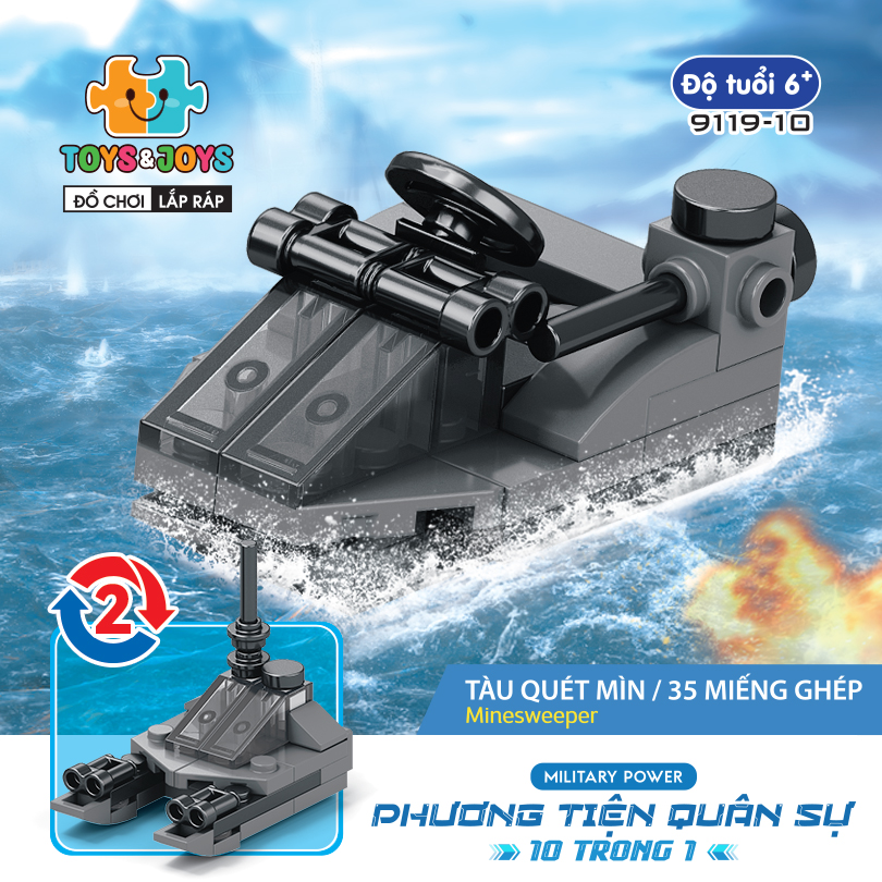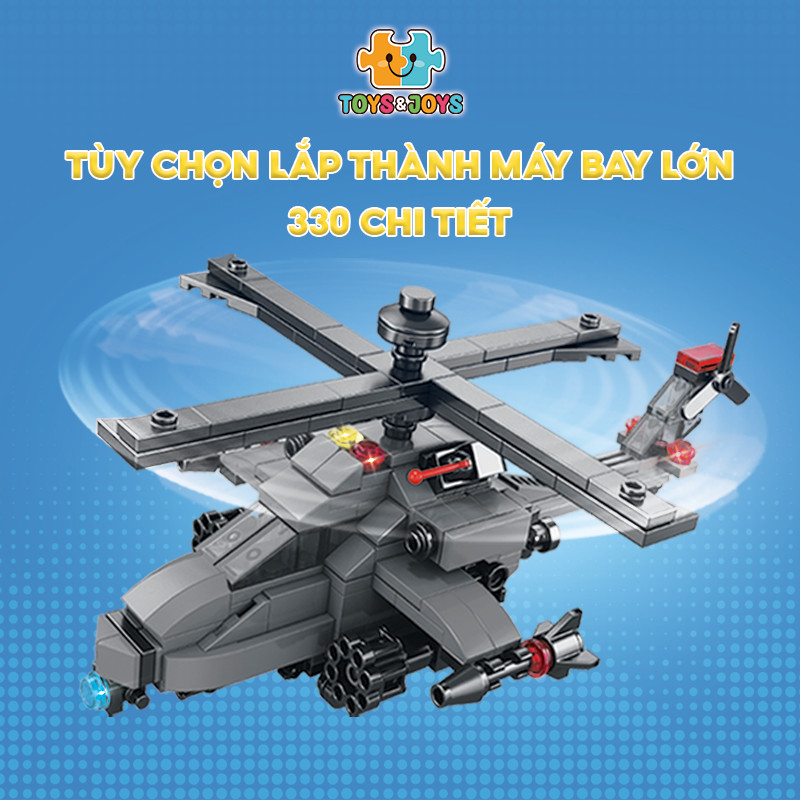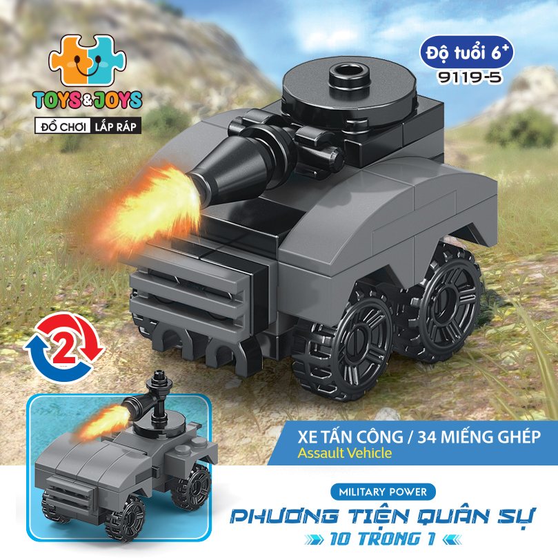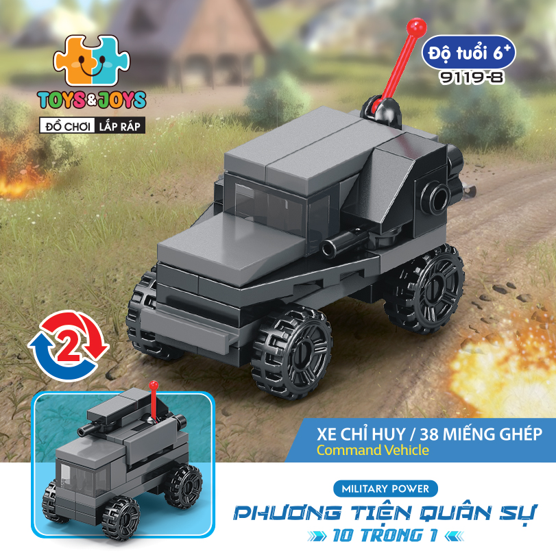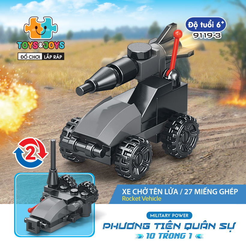 Từ 10 hộp nhỏ, bé có thể tạo nên 1 phương tiện lớn hơn là chiếc máy bay quân sự cực ngầu. Hãy tham gia những trận chiến đầy cam go và hấp dẫn ngay bây giờ cùng set Phương tiện quân sự 10 trong 1 nhé