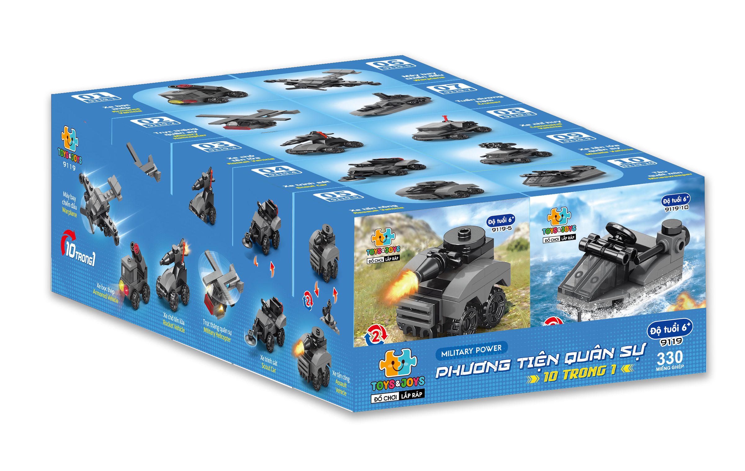 Từ mặt đất tới trên không, bé sẽ đều được trải nghiệm đầy đủ với set Phương tiện quân sự 10 trong 1, set gồm 10 hộp nhỏ tương ứng với các mẫu sau: