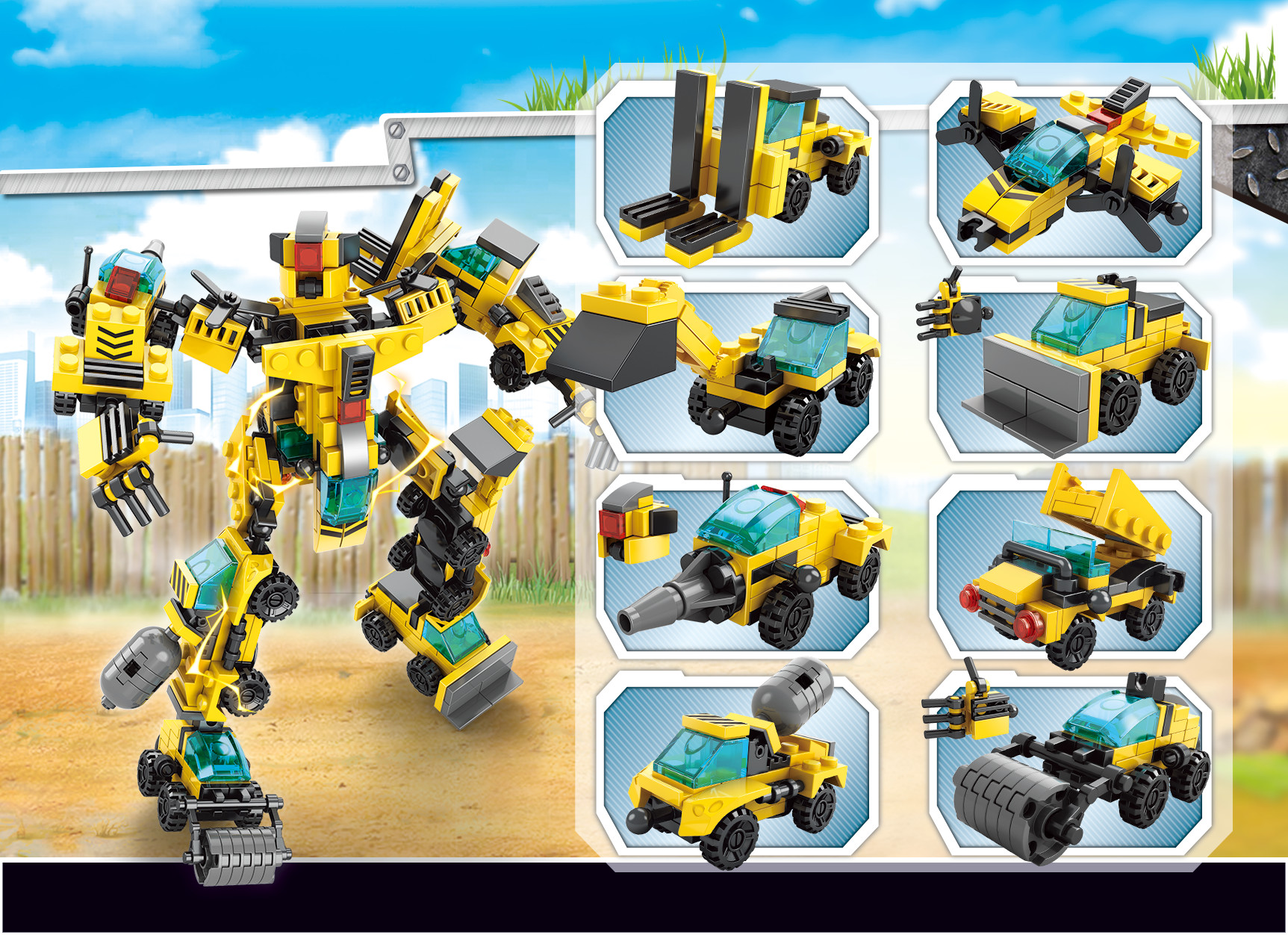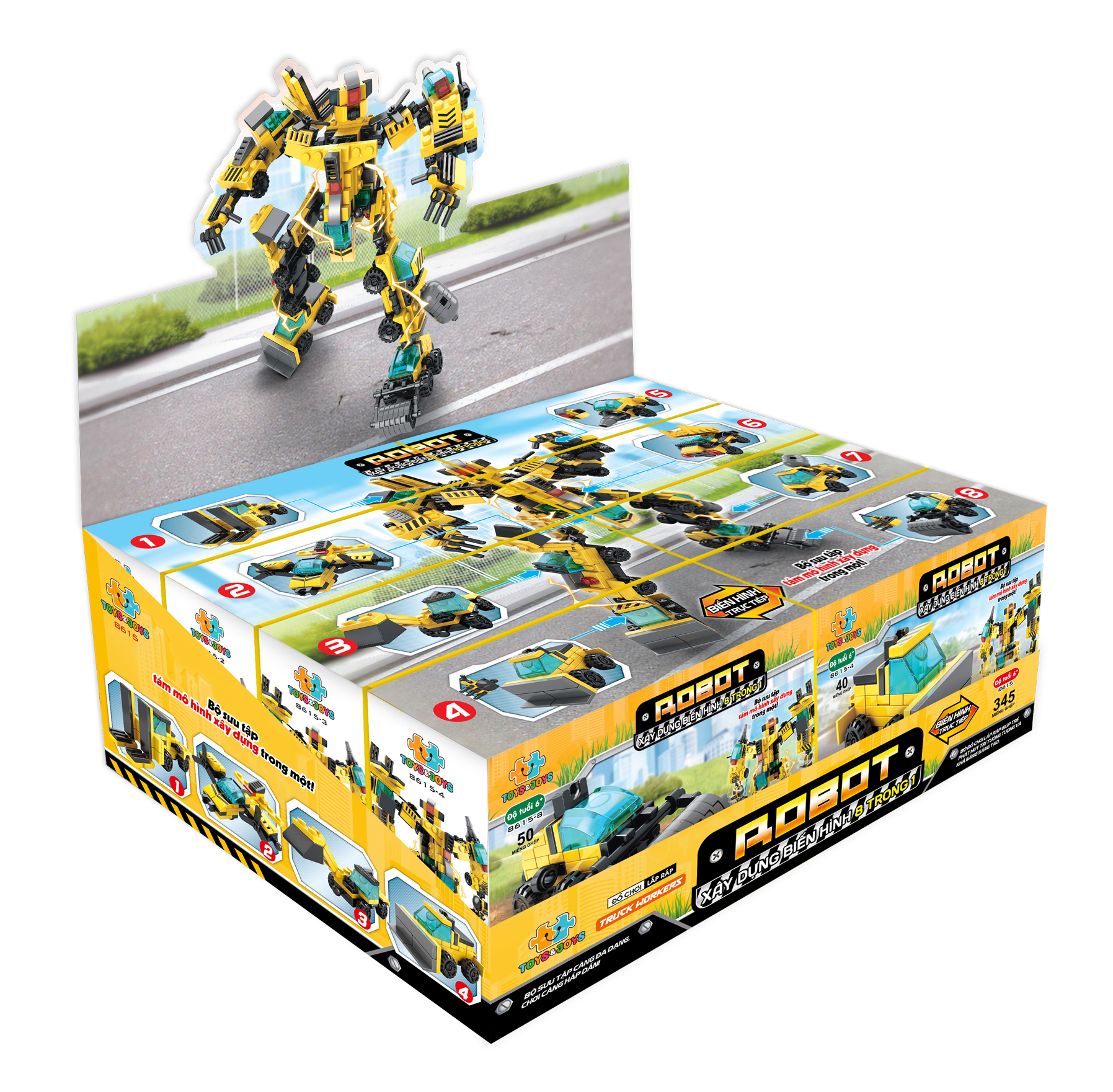 Bộ sản phẩm Robot xây dựng biến hình 8 trong 1 bao gồm 8 hộp tương ứng với 8 bộ lắp ghép nhỏ. Bé có thể lắp ghép thành 2 mô hình trong mỗi hộp như sau: