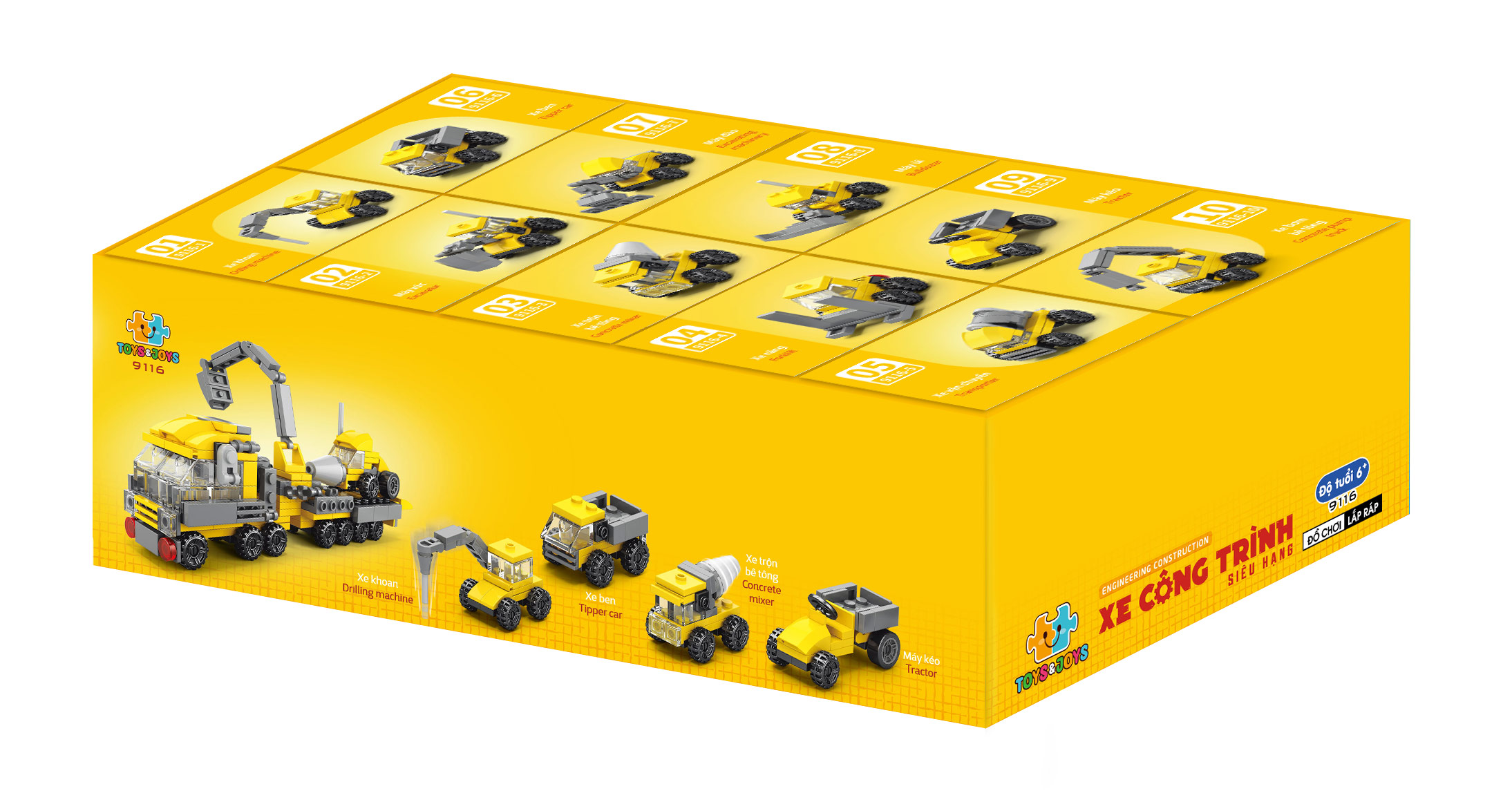 Bộ sản phẩm bao gồm 10 hộp, tương ứng với các loại xe công trình siêu hạng: