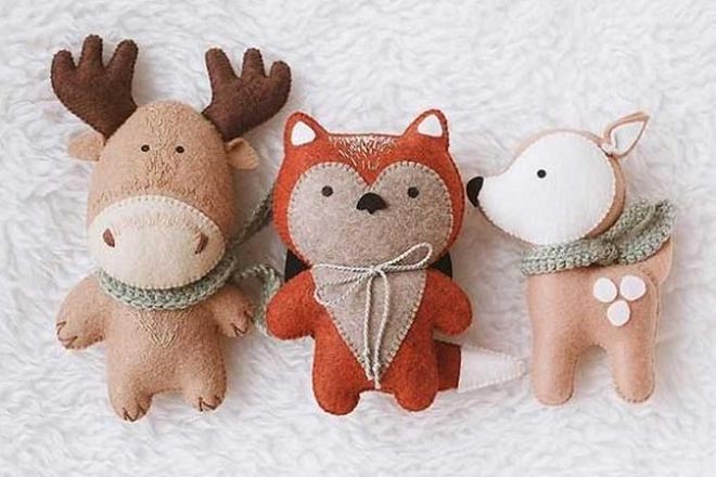 - Cách làm: Dùng vải cotton hoặc vải nỉ cắt thành hình chú gấu hoặc các động vật nhỏ. Sau đó, khâu từng mảnh vải lại với nhau, nhồi bông gòn vào bên trong, và tạo hình khuôn mặt với các chi tiết nhỏ như mắt, mũi, miệng.